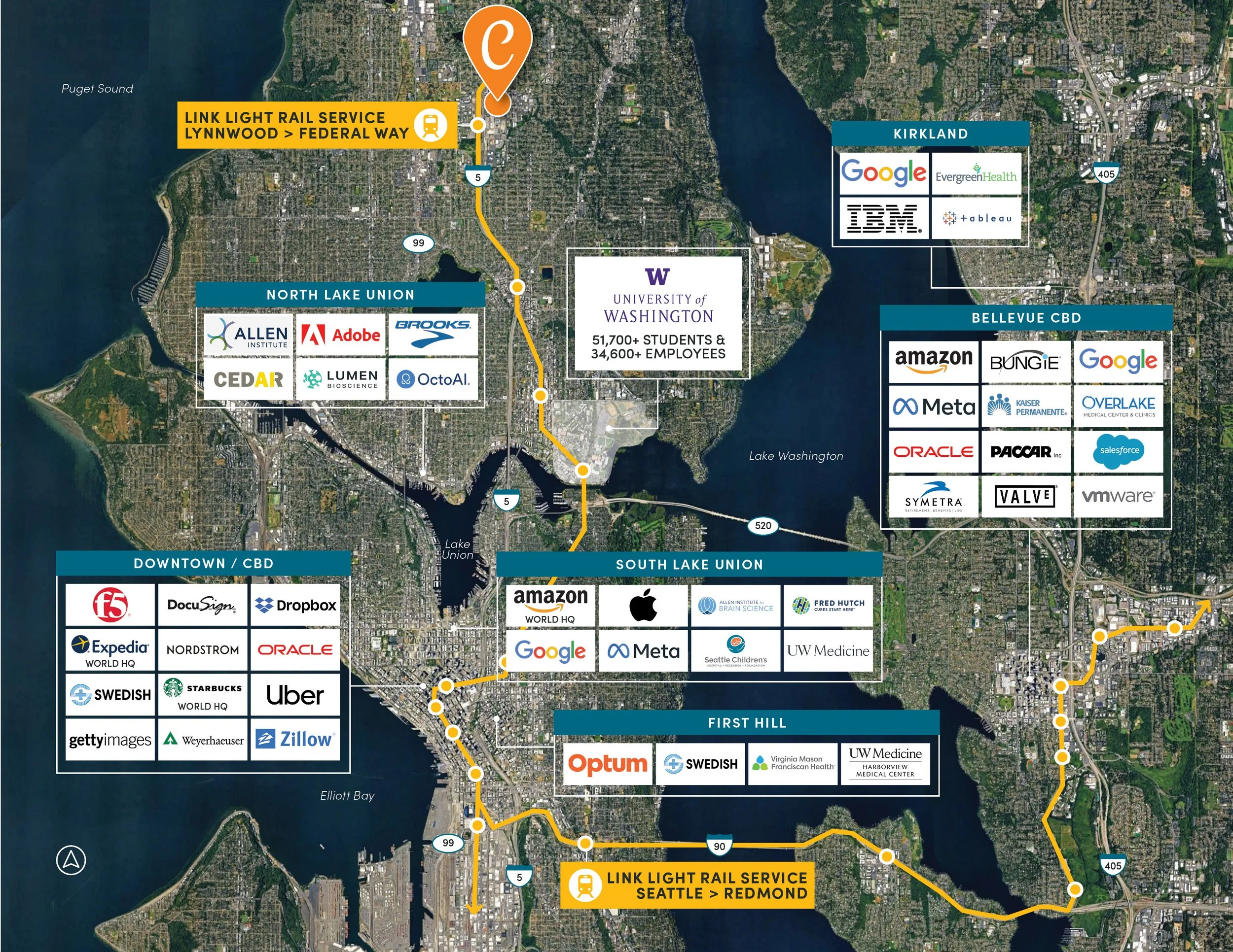 Residents enjoy convenient access to Downtown Seattle, South Lake Union, and Redmond, with major employers including Amazon, Google, Meta, Microsoft, UW, and UW Medicine all within a five to 30-minute commute.